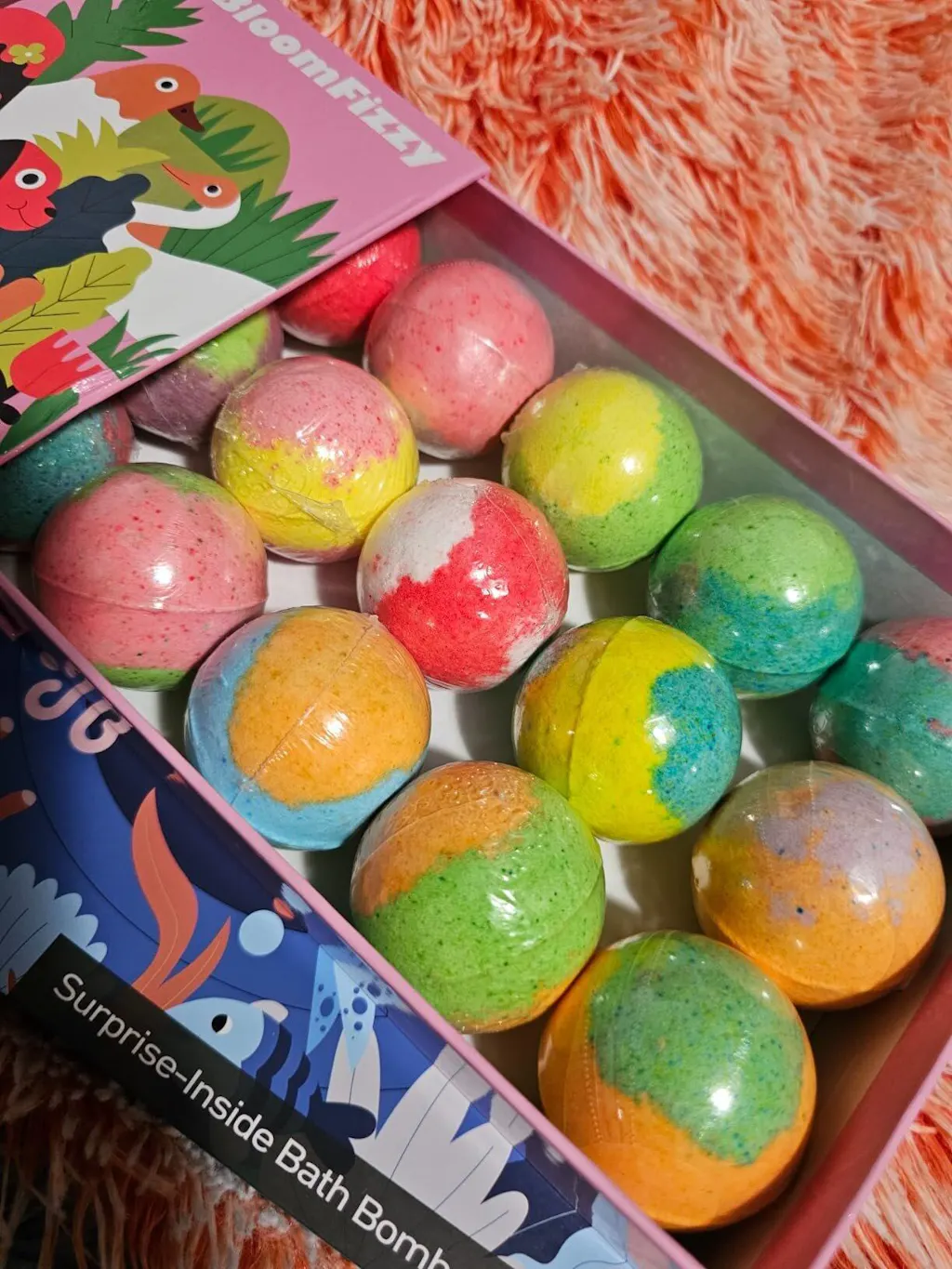 Incluye 12 sales de baño, cada una con un juguete sorpresa diferente.
